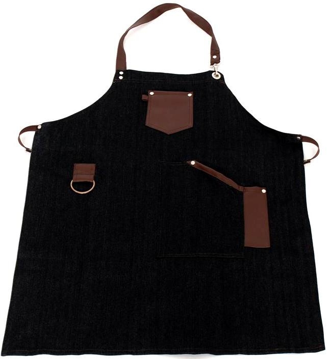 Ποδιά μαύρη τζιν με δερμάτινες λεπτομέρειες και κρίκο για την πετσέτα 85x65cm MARK713