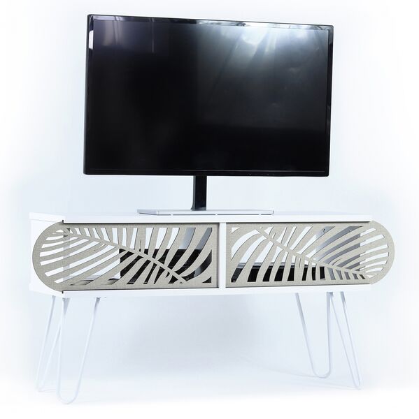 Έπιπλο τηλεόρασης με συρόμενα πορτάκια σε λευκή απόχρωση με λεπτομέρειες σε εκρού χρώμα. Κατασκευασμένο από μελαμίνη υψηλών προδιαγραφών με μεταλλικά πόδια σε λευκή απόχρωση. Διαθέτει δύο χώρους αποθήκευσης με συρόμενα πορτάκια για τις ηλεκτρονικές συσκευές σας. Το μοντέρνο design και τα ιδιαίτερα μοτίβα στα συρόμενα πορτάκια, δημιουργούν μια πρωτότυπη ατμόσφαιρα στο χώρο. Συνδυάστε το με τα υπόλοιπα έπιπλα της σειράς Sillia για να πετύχετε μια ξεχωριστή σύνθεση. Απόχρωση: Λευκό, Εκρού Διαστάσεις: 106x30x48Y εκ. Ευρωπαϊκής κατασκευής και προέλευσης. Το προϊόν διατίθεται αμοντάριστο σε εργοστασιακή συσκευασία.