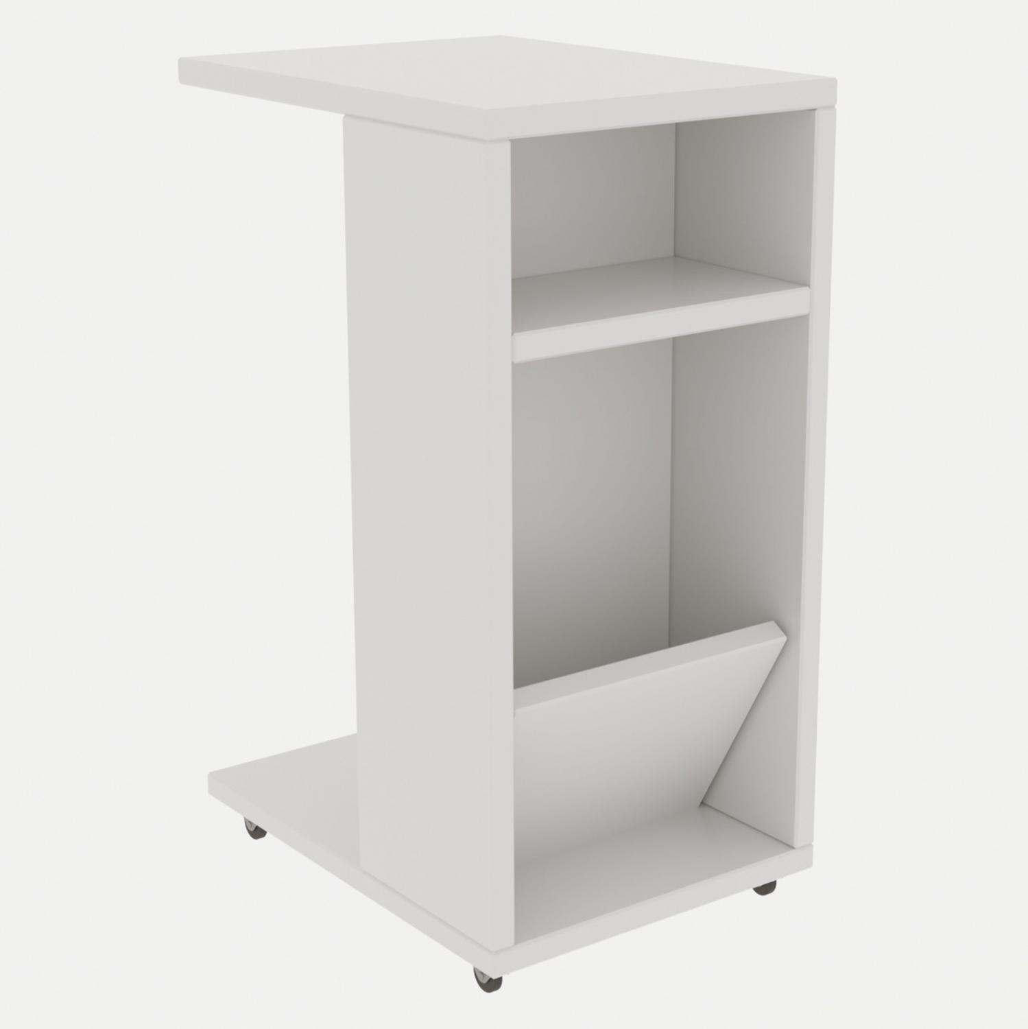 Βοηθητικό τραπέζι σαλονιού από μελαμίνη υψηλής ποιότητας πάχους 18mm. σε λευκή απόχρωση. Διαθέτει ροδάκια για εύκολη μετακίνηση. Διακρίνεται για το μοντέρνο σχεδιασμό καθώς και την εξαιρετική του ποιότητα. Ένα έπιπλο με μεγάλη ανθεκτικότητα και λειτουργικότητα, ιδανικό για το σπίτι ή το γραφείο. Μπορεί να χρησιμοποιηθεί και ως ραφιέρα καθώς διαθέτει χώρους αποθήκευσης μικροαντικειμένων και βιβλίων/περιοδικών. Απολαύστε την όμορφη ατμόσφαιρα του χώρου σας, στολίζοντας με μικρά έργα τέχνης το σαλόνι σας ή τον επαγγελματικό σας χώρο. Διαστάσεις: 30x40x63Y εκ. Ευρωπαϊκής κατασκευής και προέλευσης. Το προϊόν διατίθεται αμοντάριστο σε εργοστασιακή συσκευασία.