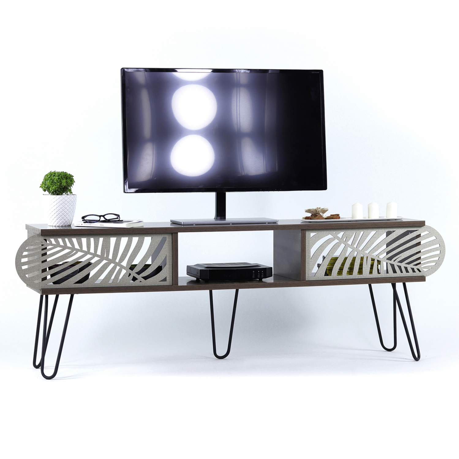 Έπιπλο τηλεόρασης με συρόμενα πορτάκια σε καρυδί απόχρωση με λεπτομέρειες σε εκρού και μαύρο χρώμα. Κατασκευασμένο από μελαμίνη υψηλών προδιαγραφών με μεταλλικά πόδια σε μαύρη απόχρωση. Διαθέτει δύο χώρους αποθήκευσης με συρόμενα πορτάκια και έναν ανοιχτό για να τοποθετήσετε τις ηλεκτρονικές συσκευές σας. Το μοντέρνο design και τα ιδιαίτερα μοτίβα στα συρόμενα πορτάκια, δημιουργούν μια πρωτότυπη ατμόσφαιρα στο χώρο. Συνδυάστε το με τα υπόλοιπα έπιπλα της σειράς Sillia για να πετύχετε μια ξεχωριστή σύνθεση. Απόχρωση: Καρυδί, Εκρού, Μαύρο Διαστάσεις: 151x30x48Y εκ. Ευρωπαϊκής κατασκευής και προέλευσης. Το προϊόν διατίθεται αμοντάριστο σε εργοστασιακή συσκευασία.