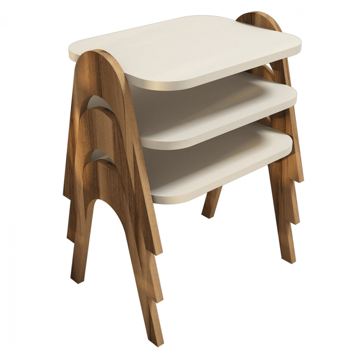 Αν αναζητάτε μια πινελιά ανανέωσης στο καθιστικό ή το υπνοδωμάτιό σας, αλλά δεν θέλετε να ξοδέψετε πολλά χρήματα, επενδύστε σε ένα σετ από βοηθητικά τραπεζάκια 3 τεμαχίων. Κατασκευασμένα από μελαμίνη πάχους 18mm υψηλής ποιότητας, με αντοχή στην καταπόνηση, την φθορά και τον χρόνο, σε καρυδί και εκρού απόχρωση. Οι στενοί χώροι δεν σημαίνει ότι πρέπει να υπολείπονται σε στυλ. Ανανεώστε το χώρο σας δίνοντας μια νότα που θα κλέψει τις εντυπώσεις. Συνολικές διαστάσεις: 48,6x35,5x72Y εκ. Διαστάσεις τραπεζιού: 48,6x35,5x42Y εκ. (x3) Ευρωπαϊκής κατασκευής και προέλευσης. Το προϊόν διατίθεται αμοντάριστο σε εργοστασιακή συσκευασία.