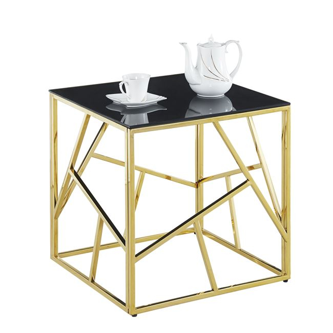 Βοηθητικό τραπεζάκι σαλονιού JANA με μεταλλικό επίχρυσο σκελετό και γυάλινη μαύρη επιφάνεια. Διαστάσεις: 55x55x55 εκ.