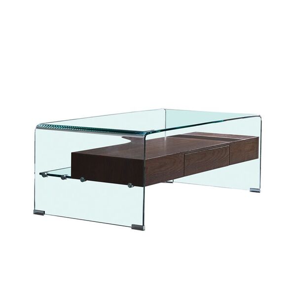 GLASSER Wood Τραπεζάκι Σαλονιού Γυαλί Clear 12mm Ράφι με Συρτάρι Απόχρωση Καρυδί-ΕΜ846-Bent Glass/Paper-1τμχ- 120x60x42cm