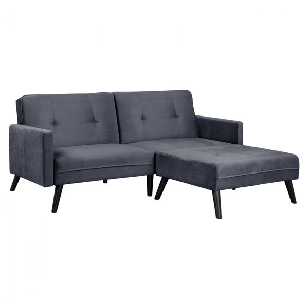 Καναπές με υποπόδιο από ύφασμα βελούδο σε γκρι απόχρωση, που μετατρέπεται σε κρεβάτι και συνεπώς εκτός από την ποιότητα και την αισθητική, προσφέρει και λειτουργικότητα που είναι απαραίτητη σε κάθε σπίτι. Ιδανική νεανική επιλογή για φοιτητικά σπίτια. Ένα άγγιγμα κομψότητας, σε συνδυασμό με αμέτρητες χρωματικές παραλλαγές και σχήματα. Το ελαφρώς λαμπερό ύφασμα με την αδιαμφισβήτητη εμφάνιση και αίσθηση δεν είναι χωρίς λόγο μια από τις ζωντανές τάσεις κατ 'εξοχήν. Η βελούδινη κάλυψη κάνει τη διαφορά! Διαστάσεις γωνίας: 211x87-158x83 εκ. Ύψος καθίσματος: 40 εκ. Ύψος μπράτσων: 59 εκ. Διαστάσεις καθίσματος: 190x51-122 εκ. Διαστάσεις κρεβατιού: 190x104-175 εκ. Διαστάσεις 3θ καναπέ: 211x87x83 εκ. Διαστάσεις ταμπουρέ: 95x71x40 εκ.
