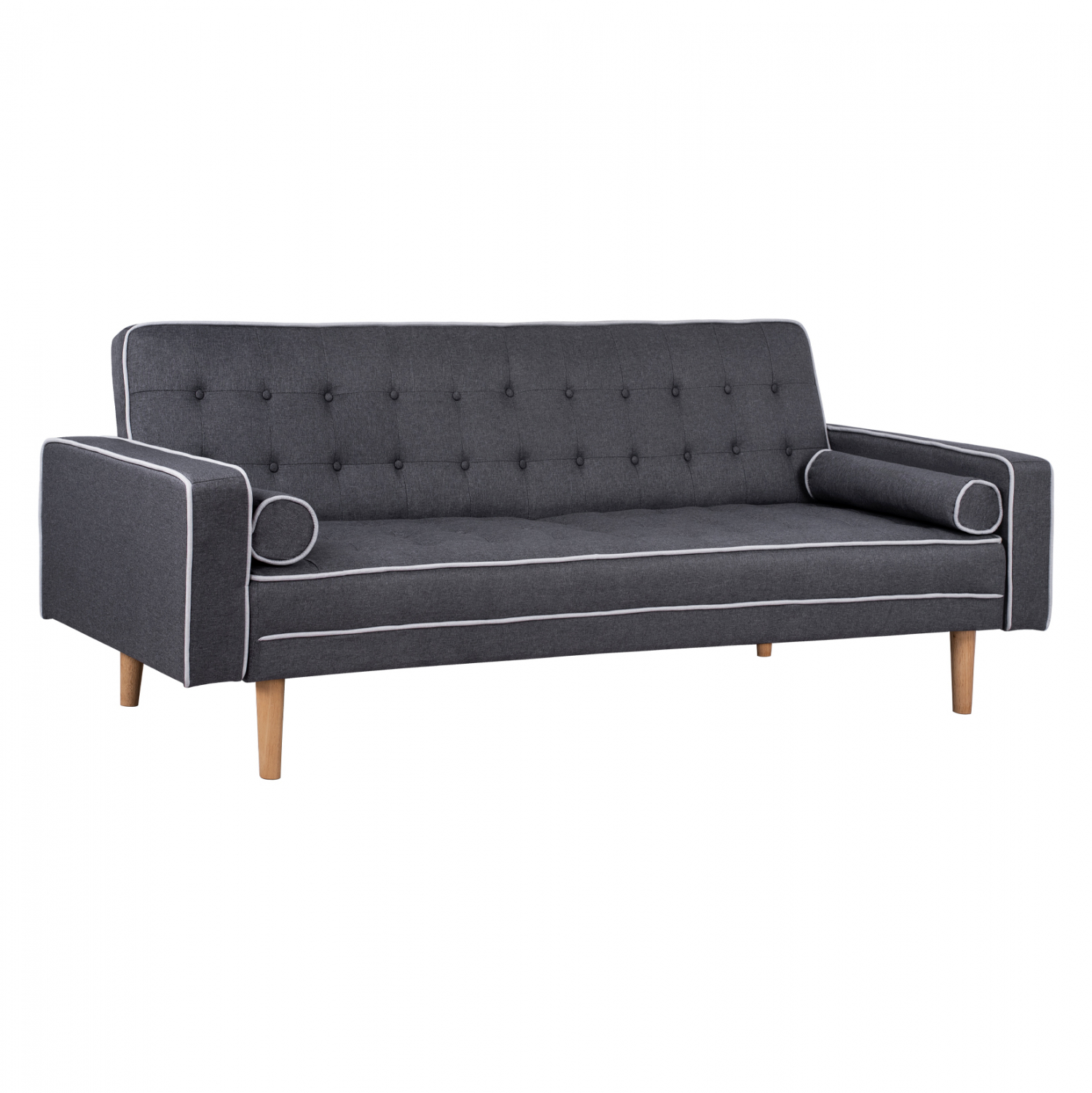 Μοντέρνος καναπές-κρεβάτι με επένδυση από ύφασμα σε γκρι απόχρωση και ανοιχό γκρι ρέλι περιμετρικά του καναπέ και διακοσμητικά κουμπιά στην πλάτη. Τα πόδια του καναπέ είναι από ξύλο σε φυσική απόχρωση, επίσης η πλάτη του, έχει την δυνατότητα να πέφτει πίσω και να μετατρέπεται εύκολα σε ένα άνετο κρεβάτι. Διαστάσεις: 224x88x84 εκ. Ύψος καθίσματος: 41 εκ. Ύψος μπράτσων: 59 εκ. Διαστάσεις καθίσματος: 167-196x57 εκ. Διαστάσεις κρεβατιού: 196x108x41 εκ.