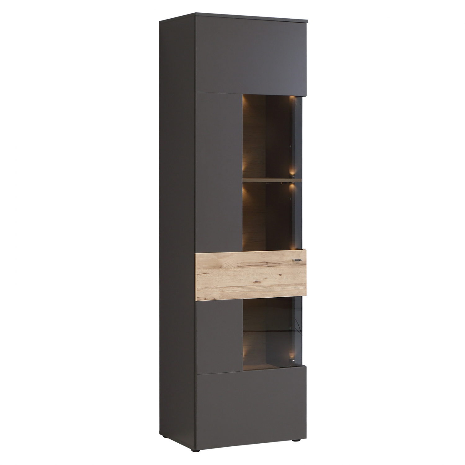 Βιτρίνα με ενσωματωμένο φωτισμό LED, σε μοντέρνο αλλά και λιτό σχεδιασμό, κατασκευασμένο από ανθεκτική μελαμίνη υψηλής ποιότητας, σε όμορφη διχρωμία από γκρι και φυσική απόχρωση. Η βιτρίνα διαθέτει εσωτερικά ράφια όπου δημιουργούν πέντε αποθηκευτικούς χώρους. Ο μοντέρνος και λιτός σχεδιασμός, είναι κάποια από τα χαρακτηριστικά που ζητάς για να συμπληρώσεις την αισθητική του σαλονιού σου, προσφέροντας πρακτικότητα με τους μεγάλους χώρους αποθήκευσης. Διαστάσεις: 60,4x41,3x203,3 εκ. Ευρωπαϊκής κατασκευής και προέλευσης. Το προϊόν διατίθεται αμοντάριστο σε εργοστασιακή συσκευασία.