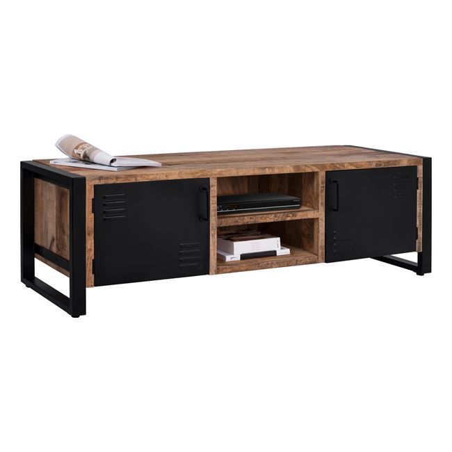 Ανακαλύψτε το μοναδικό χειροποίητο έπιπλο τηλεόρασης HM8189 από φυσικό μασίφ ξύλο mango! Με επιρροή από το industrial design, η συλλογή μας μεγαλώνει με πρωτότυπα σχέδια εμπνευσμένα από την φύση, για να επιπλώσετε το καθιστικό σας. Έπιπλο τηλεόρασης από μασίφ ξύλο Ακακίας σε φυσική απόχρωση και μεταλλικά πόδια σε μαύρο χρώμα. Διαθέτει 2 ντουλάπια με μεταλλικές πόρτες και 2 ράφια για να αποθηκεύσετε τα πράγματα σας. Διαστάσεις: 160x45,5x51 εκ. Σημείωση: Το προϊόν είναι κατασκευασμένο από φυσικό μασίφ ξύλο mango και κάθε ένα είναι μοναδικό λόγω της ανομοιομορφίας των κορμών των δένδρων. Οι υπάρχουσες ρωγμές ή αυτές που ενδέχεται να δημιουργηθούν με την πάροδο του χρόνου δίνουν πρωτοτυπία και μοναδικό design στο χώρο σας. Κατά τη διαδικασία παραγωγής γίνεται ομοιομορφοποίηση και σταθεροποίηση των ρωγμών που υπάρχουν, με υλικό κατασκευασμένο από το ίδιο ξύλο. Επομένως, μπορεί να υπάρχουν χρωματικές παραλλαγές και διαφορές στις διαστάσεις του προϊόντος λόγω των διαστάσεων του επεξεργασμένου