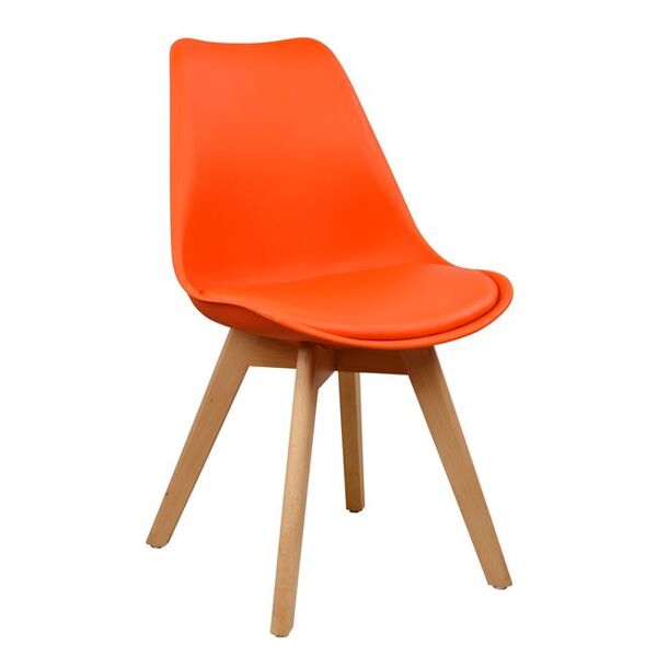 Μία μοντέρνα καρέκλα σε έναν άψογο συνδυασμό ξύλου-πολυπροπυλενίου-τεχνοδέρματος για να αναδείξει κάθε γωνία του σπιτιού σας ή του επαγγελματικού σας χώρου. Το κάθισμα της καρέκλας και ο σκελετός είναι μονοκόμματα και καθιστούν την καρέκλα μεγάλης αντοχής. Σκελετός & πόδια: Μασίφ ξύλο οξιάς σε φυσικό χρώμα. Κάθισμα: Υψηλής ποιότητας πολυπροπυλένιο με δερμάτινο PU μαξιλαράκι σε πορτοκαλί χρώμα. Διαστάσεις: 47x56,6x82 εκ. Ύψος καθίσματος: 48 εκ. ΠΡΟΣΟΧΗ: Το προϊόν διατίθεται αμοντάριστο σε πακέτο των τεσσάρων τεμαχίων και πωλείται ανά 4 τμχ.