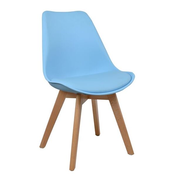 Μία μοντέρνα καρέκλα σε έναν άψογο συνδυασμό ξύλου-πολυπροπυλενίου-τεχνοδέρματος για να αναδείξει κάθε γωνία του σπιτιού σας ή του επαγγελματικού σας χώρου. Το κάθισμα της καρέκλας και ο σκελετός είναι μονοκόμματα και καθιστούν την καρέκλα μεγάλης αντοχής. Σκελετός & πόδια: Μασίφ ξύλο οξιάς σε φυσικό χρώμα. Κάθισμα: Υψηλής ποιότητας πολυπροπυλένιο με δερμάτινο PU μαξιλαράκι σε σιέλ χρώμα. Διαστάσεις: 47x56,6x82 εκ. Ύψος καθίσματος: 48 εκ. ΠΡΟΣΟΧΗ: Το προϊόν διατίθεται αμοντάριστο σε πακέτο των τεσσάρων τεμαχίων και πωλείται ανά 4 τμχ.