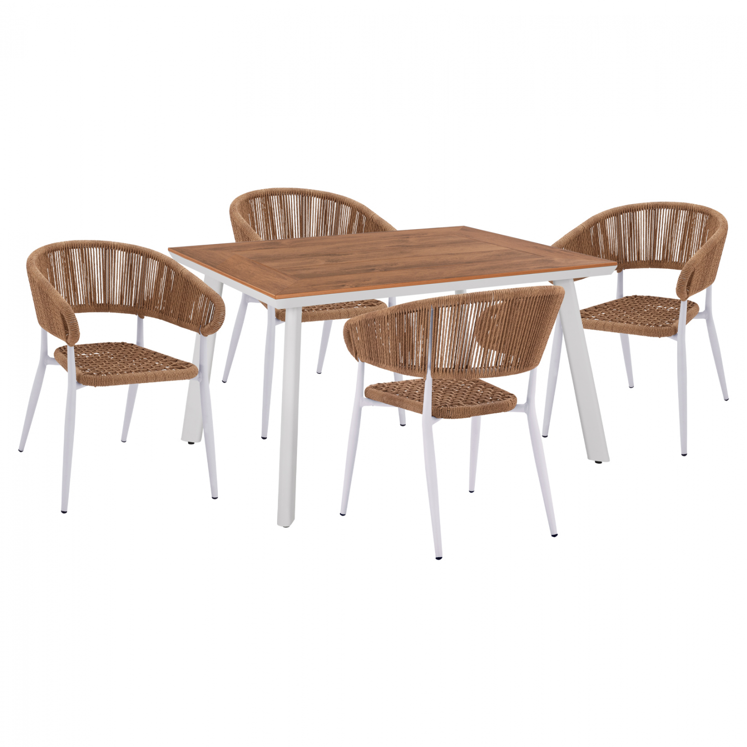 Σετ τραπεζαρίας 4 θέσεων. ΤΟ ΣΕΤ ΠΕΡΙΛΑΜΒΑΝΕΙ Ένα τραπέζι τραπεζαρίας από σκελετό αλουμινίου σε λευκή απόχρωση, και επιφάνεια Polywood φυσικής απόχρωσης. Το Polywood είναι ένα υλικό που παράγεται από 100% ανακυκλώσιμη πλαστική ξυλεία και άλλων συνθετικών υλών σε πολύ υψηλές θερμοκρασίες. Έχει κατασκευαστεί για να αντέχει σε όλες τις καιρικές συνθήκες (ήλιο και βροχή) και δεν απαιτεί συντήρηση. Προσοχή , να αποφεύγεται η επαφή με καυτές επιφάνειες και τοξικά χημικά προιόντα καθώς υπάρχει κίνδυνος διάβρωσης του υλικού. Διαστάσεις τραπεζιού: 120x80x72,5Υ εκ. Πόδια: 112x72 εκ. Τέσσερις μοντέρνες πολυθρόνες, κατασκευασμένες από σκελετό αλουμινίου σε λευκή απόχρωση, επενδυμένες με πλεκτό ενισχυμένο PE σχοινί στο κάθισμα και στην πλάτη σε μπεζ απόχρωση. Είναι μια πολυθρόνα άριστης ποιότητας και κατασκευής με χειροποίητη πλέξη στο κάθισμά της. Διαστάσεις: 56x60x78 εκ. Ύψος καθίσματος: 44 εκ. Διαστάσεις καθίσματος: 42x44 εκ. Ύψος μπράτσων: 71 εκ. Διαστάσεις μπράτσων: 43x17 εκ. Διαστάσεις πλάτης