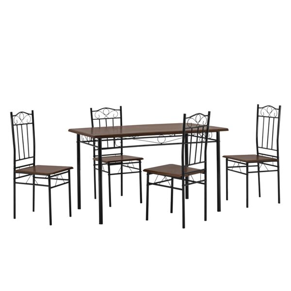 Το σετ τραπεζαρίας 5 τμχ, αποτελείται από ένα τραπέζι και τέσσερις καρέκλες. Είναι κατασκευασμένο από μεταλλικό σκελετό σε μαύρη απόχρωση και επένδυση από mdf σε καρυδί απόχρωση . Διαστάσεις τραπεζιού: 120x70x74 εκ. Απόσταση ποδιών: 108x56 εκ. Ύψος ποδιών: 72 εκ. Διαστάσεις καρέκλας: 38x43x91Υ εκ. Διαστάσεις καθίσματος: 38x37 εκ. Ύψος καθίσματος: 43,5 εκ. Διαστάσεις πλάτης: 33x49 εκ. Απόσταση ποδιών: 32,5x36 εκ. Ύψος ποδιών: 42 εκ.