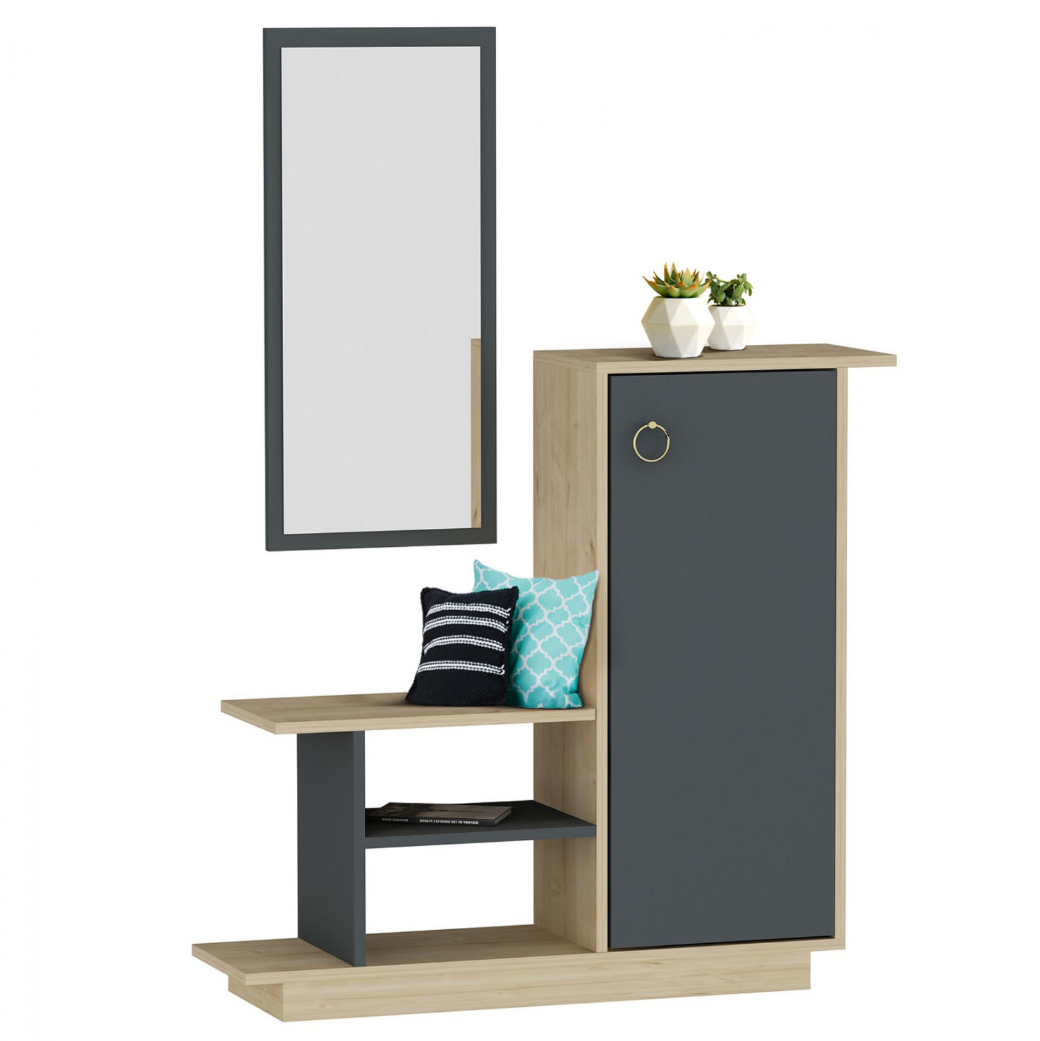Έπιπλο εισόδου με λιτό σχεδιασμό, κατασκευασμένο από ανθεκτική μελαμίνη πάχους 18 χιλιοστών, σε διακριτική διχρωμία φυσικού και ανθρακί χρώματος. Αποτελείται από ένα ντουλάπι με τρεις εσωτερικούς χώρους αποθήκευσης και δύο ανοιχτούς χώρους όπου μπορείτε να τοποθετήσετε τα παπούτσια σας. Επίσης διαθέτει έναν καθρέπτη με ανθρακί πλαίσιο. Δημιουργήσετε έναν καλά οργανωμένο και τακτοποιημένο χώρο στην είσοδο του σπιτιού σας. Τα έπιπλα εισόδου καταλαμβάνουν λιγότερο χώρο και αποτελούν μία πρακτική πρόταση διακόσμησης για τον χώρο υποδοχής του σπιτιού σας. Διαστάσεις: 80x29,5x49,6-90-180 εκ. Διαστάσεις καθρέπτη: 29,5x60 εκ. Ευρωπαϊκής κατασκευής και προέλευσης. Το προϊόν διατίθεται αμοντάριστο σε εργοστασιακή συσκευασία.
