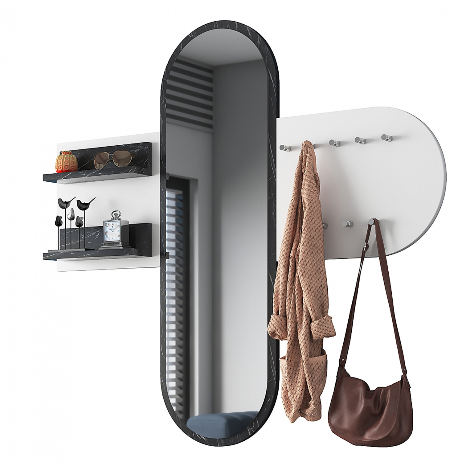 Έπιπλο εισόδου με μοναδικό στυλ, που θα δώσει ένα υπέροχο αποτέλεσμα στην είσοδο του σπιτιού σας. Κατασκευασμένο από ανθεκτική μελαμίνη πάχους 18 mm. σε λευκή απόχρωση με λεπτομέρειες από εφέ μαύρου μαρμάρου. Διαθέτει έναν καθρέπτη, δυο ραφάκια για τοποθέτηση μικροαντικειμένων και μια ευρύχωρη κρεμάστρα. Δημιουργήσετε έναν καλά οργανωμένο και τακτοποιημένο χώρο στην είσοδο του σπιτιού σας. Τα έπιπλα εισόδου καταλαμβάνουν λιγότερο χώρο και αποτελούν μία πρακτική πρόταση διακόσμησης για τον χώρο υποδοχής του σπιτιού σας. Απόχρωση: Λευκό, Μαύρο Μάρμαρο Διαστάσεις: 125x12x122Y εκ. Διαστάσεις κρεμάστρας: 45x40Y εκ. Διαστάσεις καθρέπτης: 40x122Υ εκ. Διαστάσεις ραφιών: 30x10Y εκ. (x2) Ευρωπαϊκής κατασκευής και προέλευσης. Το προϊόν διατίθεται αμοντάριστο σε εργοστασιακή συσκευασία.