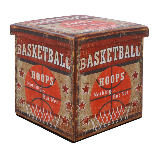 Στολίστε το χώρο και κρύψτε τα πράγματα που δεν θέλετε να φαίνονται με ένα πολύ όμορφο τρόπο. Σκαμπώ πτυσσόμενο με αποθηκευτικό χώρο επενδυμένο με τεχνόδερμα. Σχέδιο: Basketball Διαστάσεις: 38x38x38 εκ.