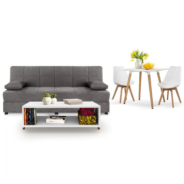 Σετ 5 τμχ περιέχει καναπέ - κρεβάτι, τραπέζι σαλονιού, τραπέζι κουζίνας και 2 καρέκλες κουζίνας. Κωδ. HM3067.03 Ένα καναπέ που μετατρέπεται πολύ εύκολα με μια κίνηση σε κρεβάτι με αποθηκευτικό χώρο. Διαστάσεις καναπέ: 192x74x82 εκ. Διαστάσεις κρεβατιού: 192x104x41 εκ. Χρώμα υφάσματος: Γκρι Κωδ. HM2245.12 Ένα τραπεζάκι σαλονιού κατασκευασμένο από μελαμίνη πάχους 18mm σε λευκή απόχρωση με πόδια σε χρώμα οξιάς. Διαστάσεις: 93,5x60,5x28,5 εκ. Κωδ. HM0057.01 Ένα τραπέζι κουζίνας κατασκευασμένο από επιφάνεια mdf σε λευκή απόχρωση και πόδια από μασίφ ξύλο. Διαστάσεις: 80x80x74 εκ. Κωδ. HM0033.01 Δύο καρέκλες κουζίνας κατασκευασμένες από πολυπροπυλένιο σε λευκή απόχρωση με μαξιλαράκι από τεχνόδερμα και πόδια από μασίφ ξύλο. Διαστάσεις: 47x56,6x82 εκ. Ύψος καθίσματος: 48 εκ.