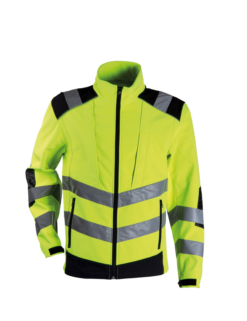 Bright Softshell Jacket. Αδιάβροχο μπουφάν υψηλής ορατότητας με επένδυση σε ελαστικό softshell ύφασμα. Κλείσιμο με φερμουάρ εμπρός και στις τσέπες. Ανακλαστικές λωρίδες. Ποιότητα : Softshell polyester-spandex 290gr/m2 με επένδυση . Πιστοποίηση: EN ISO : 343, 20471:2019