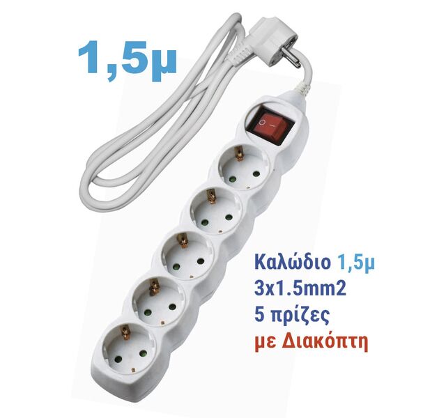Πολύπριζο 5 Θέσεων Σούκο Με Καλώδιο 3x1.5mm² 1.5m Και Διακόπτη