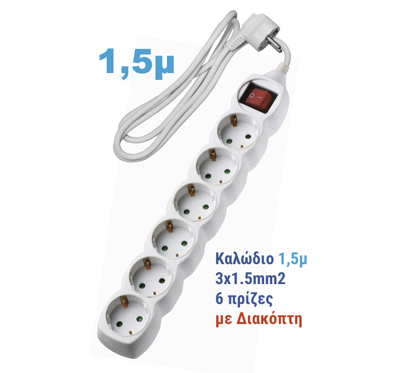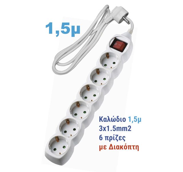 Πολύπριζο 6 Θέσεων Σούκο Με Καλώδιο 3x1.5mm² 1.5m Και Διακόπτη