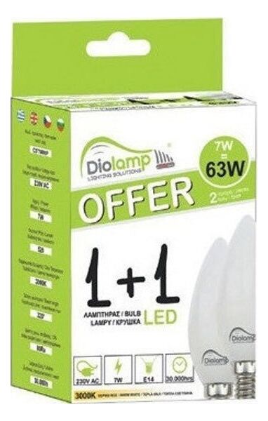 Λαμπτήρας Led E14 7w 1+1 Pack 550lm 6000K Cool White 200° 37*100mm Diolamp C377CWP