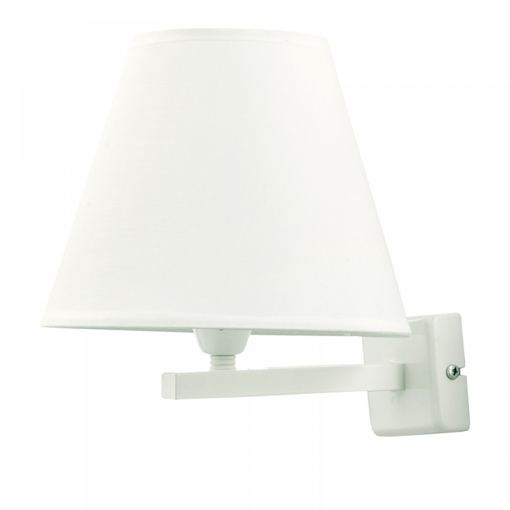 Απλίκα τοίχου με υφασμάτινο καπέλο και μεταλλική βάση σε λευκό χρώμα. Το υφασμάτινο λευκό καπέλο συμπληρώνει την εικόνα του δίνοντας έναν πιο απαλό φωτισμό. Δέχεται ένα λαπτήρα με βάση E27 και μέγιστη ισχύ 40W. &C