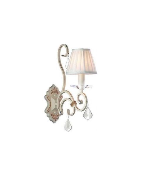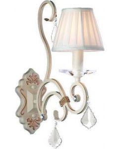 Πρόκειται για ένα μπεζ μεταλλικό επιτοίχιο φωτιστικό με έναν λαμπτήρα και διακριτική ύπαρξη κρυστάλλων. Το μπεζ υφασμάτινο καπέλο που καλύπτει τον λαμπτήρα δίνει έναν απαλό φωτισμό στον χώρο. Δέχεται ένα λ&al
