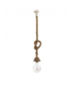 Μονόφωτο κρεμαστό φωτιστικό κατασκευασμένο από σχοινί και μεταλλική λευκή λεπτομέρεια στην οροφή. Το ύψος του μπορεί να ρυθμιστεί είτε κόβοντάς το σχοινί, είτε πλέκοντάς το δημιουργώντας επιπλέον