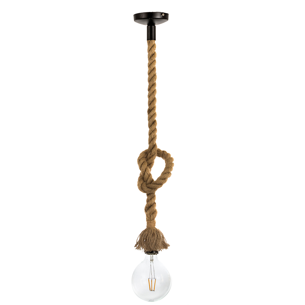 Μονόφωτο κρεμαστό φωτιστικό κατασκευασμένο από σχοινί και μεταλλική μαύρη λεπτομέρεια στην οροφή. Το ύψος του μπορεί να ρυθμιστεί είτε κόβοντάς το σχοινί, είτε πλέκοντάς το δημιουργώντας επιπλέον κό&mu