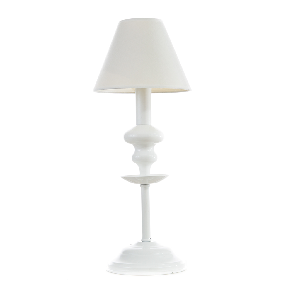 Πρόκειται για ένα λευκό μεταλλικό επιτραπέζιο φωτιστικό με ιδιαίτερη σχεδίαση. Το λευκό υφασμάτινο καπέλο το συμπληρώνει δίνοντας έναν πιο ατμοσφαιρικό φωτισμό στον χώρο. Δέχεται ένα λαμπτήρα με βάση E14 &