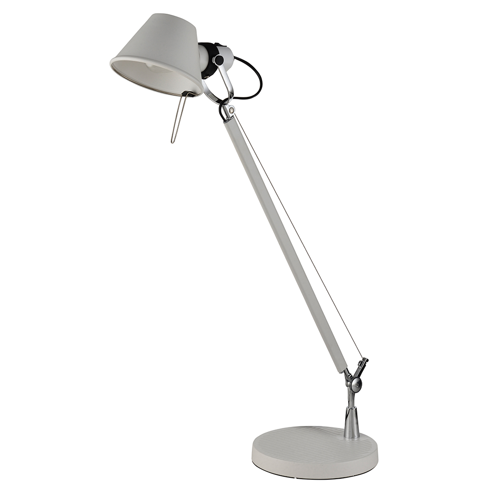 Πρόκειται για ένα μεταλλικό επιτραπέζιο φωτιστικό σε λευκή απόχρωση. Οι χρώμιο λεπτομέρειες του δίνουν τη λάμψη που χρειάζεται. Οι μεταλλικοί βραχίονες κινούνται όπως και το μεταλλικό καπάκι πο&up