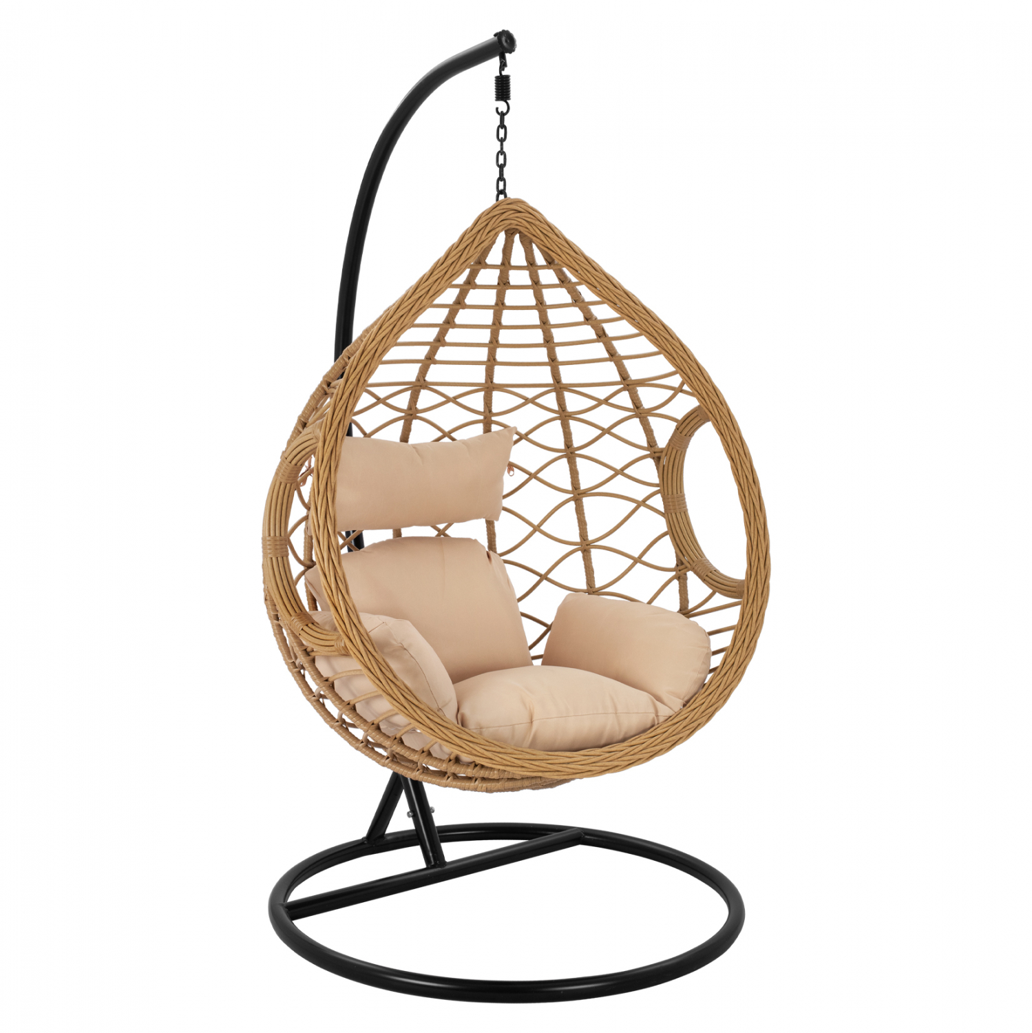 Κρεμαστή κούνια κατασκευασμένη από μέταλλο και πλέξη wicker υψηλής ποιότητας και ανθεκτικότητας στον χρόνο σε φυσική απόχρωση. Το υλικό wicker rattan έχει μεγάλη ανθεκτικότητα σε υψηλές θερμοκρασίες [-85C έως +85C ] είναι επίσης εμπλουτισμένο με σταθεροποιητή UV για τις ακτίνες του ηλίου. Έχει μεγάλη αντοχή στις δύσκολες καιρικές συνθήκες όπως η βροχή και οι υπεριώδεις ακτίνες του ήλιου. Η βάση της είναι ιδιαίτερα στοιβαρή κατασκευασμένη από σίδερο σε μαύρη απόχρωση. Διαθέτει αποσπώμενα μαξιλάρια μπεζ χρώματος, γεγονός που βοηθάει στην καλύτερη καθαριότητά τους. Έχει ρυθμιζόμενο ύψος καθίσματος και αποτελεί ιδανική επιλογή για τον κήπο ή το μπαλκόνι σας και μπορεί να ανανεώσει τον χώρο που θα τοποθετηθεί χάρη στον ιδιαίτερο σχεδιασμό της. Η κούνια έχει το σχήμα φωλιάς δημιουργώντας μία αίσθηση ασφάλειας και προσφέροντας χαλάρωση και αναπαυτικότητα. Τεχνικά χαρακτηριστικά: Πλέξη Wicker/Rattan Σκελετός μεταλλικός Καλάθι (κάθισμα) Μαξιλάρια (δύο ξεχωριστά τεμάχια, με κορδονάκι για να τα π