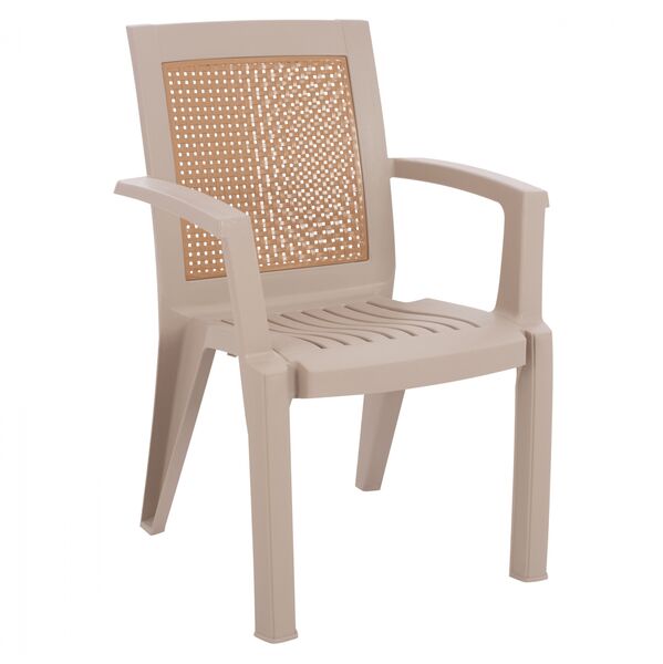Καρέκλα με μπράτσα σε μοντέρνο σχεδιασμό και μεγάλη αντοχή σε εκρού απόχρωση, με διάτρητη πλάτη σε απόχρωση καπουτσίνο. Ιδανική για επαγγελματικούς χώρους αλλά και για το σπίτι σας, θα σας χαρίσει άνεση και ξεκούραση. Διαστάσεις: 59x59x88 εκ. Ύψος καθίσματος: 44 εκ. Ύψος μπράτσων: 64 εκ. Διαστάσεις καθίσματος: 43x44 εκ