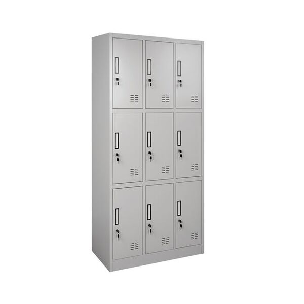 Φοριαμός μεταλλικός ιδανικός για αποδυτήρια αθλητών ή επιχειρήσεων, μπορεί επίσης να προσθέσει μια κομψή νότα βιομηχανικού στιλ στο σπίτι σας. Διαθέτει 9 ντουλάπια με κλειδαριά, με άπλετο αποθηκευτικό χώρο για να διατηρείτε τα ρούχα και άλλα και προσωπικά σας αντικείμενα ασφαλή. Διαστάσεις: 90x45x185 εκ. Πλάτος 29εκ Βάθος 34 εκ Υψος 57 εκ Παρατηρήσεις: Το προϊόν παραδίδεται αμοντάριστο, σε εργοστασιακή συσκευασία με αναλυτικές οδηγίες συναρμολόγησης. Συνιστάται η συναρμολόγηση του προϊόντος, να πραγματοποιηθεί από εξειδικευμένο τεχνικό συνεργείο.