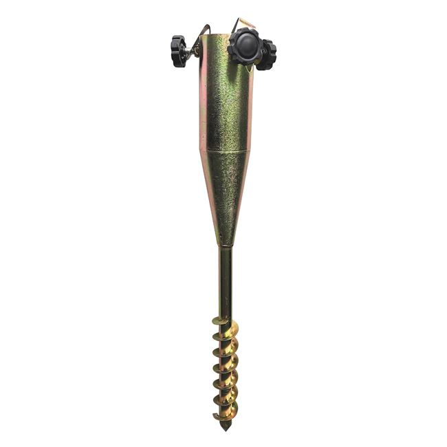 Βιδωτή βάση ομπρέλας Φ65 mm. μεγάλης αντοχής βαρέως τύπου κατασκευασμένη από ατσάλι. Έχει εύκολη μεταφορά λόγω του μικρού μεγέθους και χαμηλού βάρους της. Ενδείκνυται για επαγγελματική χρήση. Ύψος: 56 εκ. Βάρος: 1,4 kg Υλικό: ατσάλι Συμβατό με διαμέτρους: 22 mm – 55mm Εφαρμογές: ’μμος / Μαλακό έδαφος/ Ελαφρά πετρώδες έδαφος