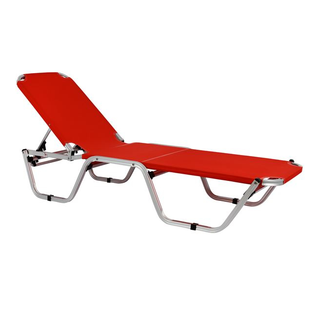 Επαγγελματική ξαπλώστρα παραλίας από αλουμίνιο και κόκκινο textline. Προδιαγραφές: Τέσσερις (4) μπάρες στήριξης με γραμμώσεις (νεύρα) που αυξάνουν την ακαμψία του σωλήνα (τρεις τετράγωνες και μια στρόγγυλη περιμετρικά κολλημένες) για μεγαλύτερη σταθερότητα. Ανοξείδωτες βίδες. Ειδικά μαλακά πλαστικά στο κάτω μέρος για μεγαλύτερη αντοχή στην αποθήκευση. Σκελετός: Αλουμινίου 25x25x1,5mm. πάχος (approx thickness) Υλικό: Textline 2x1 - 600gr. (overnylon) Νήμα: 1300 D. Διπλό πανί στο κεντρικό σημείο του καθίσματος για μεγαλύτερη ανθεκτικότητα. Θερμοκολλημένο ύφασμα για μεγαλύτερη αντοχή. Σκαλιέρες από πρωτογενές πλαστικό Διαστάσεις: 60x190x30 εκ. (προφίλ 25x1,5mm) Πλεονεκτήματα: Στοιβαζόμενη, Ανατομική, Ελαφριά