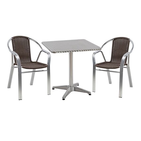 ΤΟ ΣΕΤ ΠΕΡΙΛΑΜΒΑΝΕΙ Ένα τραπέζι 4νυχο κατασκευασμένο από σκελετό αλουμινίου σε απόχρωση χρωμίου με ενιαία επιφάνεια που καλύπτει τις άκρες. Διαστάσεις: 70x70x72Y εκ. Δύο πολυθρόνες με διπλό σκελετό αλουμινίου μεγάλης αντοχής σε απόχρωση χρωμίου και καφέ rattan στο κάθισμα και την πλάτη. Διαστάσεις: 56x60x75Υ εκ. Ύψος καθίσματος: 43 εκ. Ύψος μπράτσων: 58 εκ.