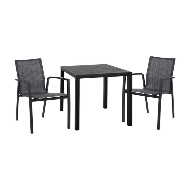 ΤΟ ΣΕΤ ΠΕΡΙΛΑΜΒΑΝΕΙ Ένα τραπέζι τραπεζαρίας, κατασκευασμένο από αλουμίνιο σε μαύρη απόχρωση, το καθιστά κατάλληλο για χρήση σε εσωτερικούς αλλά και εξωτερικούς χώρους. Διαστάσεις: 80x80x75,5Υ εκ. Δύο πολυθρόνες με μοντέρνο σχεδιασμό, κατασκευασμένες από σκελετό αλουμινίου σε ανθρακί χρώμα & επενδυμένες με textilene σε μαύρη απόχρωση. Διαστάσεις: 57x62x89Υ εκ. Ύψος καθίσματος: 44 εκ. Ύψος μπράτσων: 63,5 εκ. Διαστάσεις καθίσματος: 44,5x45 εκ. Ιδανική για επαγγελματικούς χώρους αλλά και για το σπίτι σας, θα σας χαρίσει άνεση και ξεκούραση.