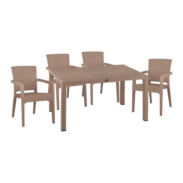 ΤΟ ΣΕΤ ΠΕΡΙΛΑΜΒΑΝΕΙ Ένα τραπέζι πολυπροπυλενίου εξωτερικού χώρου σε απόχρωση καπουτσίνο με rattan λεπτομέρειες περιμετρικά της επιφάνειας. Διαθέτει UV protection για μεγαλύτερη προστασία από τον ήλιο. Διαστ. Τραπεζιού: 150x90x73,5Υ εκ. Τέσσερις πολυθρόνες εξωτερικού χώρου με μπράτσα απο πολυπροπυλένιο σε μοντέρνο σχεδιασμό και μεγάλη αντοχή σε απόχρωση καπουτσίνο. Πολύ στοιβαρής κατασκευής. Διαστάσεις: 58x55x87 εκ. Ύψος καθίσματος: 46 εκ. Ύψος μπράτσων: 64 εκ. Διαστάσεις καθίσματος: 47x47 εκ.