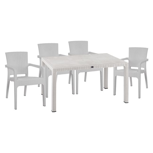 ΤΟ ΣΕΤ ΠΕΡΙΛΑΜΒΑΝΕΙ Ένα τραπέζι πολυπροπυλενίου εξωτερικού χώρου σε λευκή απόχρωση με rattan λεπτομέρειες περιμετρικά της επιφάνειας. Διαθέτει UV protection για μεγαλύτερη προστασία από τον ήλιο. Διαστ. Τραπεζιού: 150x90x73,5Υ εκ. Τέσσερις πολυθρόνες εξωτερικού χώρου με μπράτσα από πολυπροπυλένιο σε μοντέρνο σχεδιασμό και μεγάλη αντοχή σε λευκή απόχρωση. Πολύ στοιβαρής κατασκευής. Διαστάσεις: 58x55x87 εκ. Ύψος καθίσματος: 46 εκ. Ύψος μπράτσων: 64 εκ. Διαστάσεις καθίσματος: 47x47 εκ.