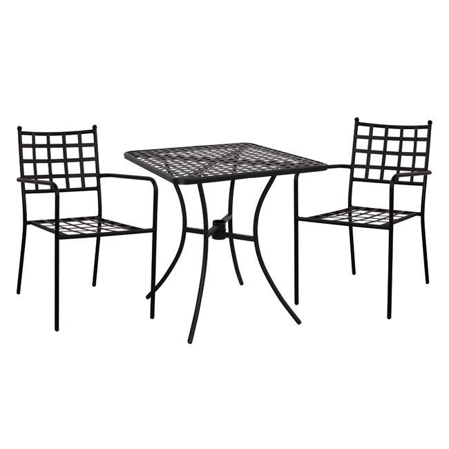ΤΟ ΣΕΤ ΠΕΡΙΛΑΜΒΑΝΕΙ Ένα μεταλλικό τραπέζι σε μαύρο χρώμα. Κατασκευασμένο από μέταλλο και αυτό το καθιστά κατάλληλο για χρήση σε εσωτερικούς αλλά και εξωτερικούς χώρους. Διαστάσεις: 70x70x73 εκ. Διαστάσεις βάσης: 50x50 εκ. Δύο πολυθρόνες εξωτερικού χώρου με μεταλλικό σκελετό σε μαύρη απόχρωση. Διαστάσεις: 53x57x88 εκ. Ύψος μπράτσου: 66 εκ. Ύψος καθίσματος: 44 εκ. Διάσταση καθίσματος: 42x44 εκ.