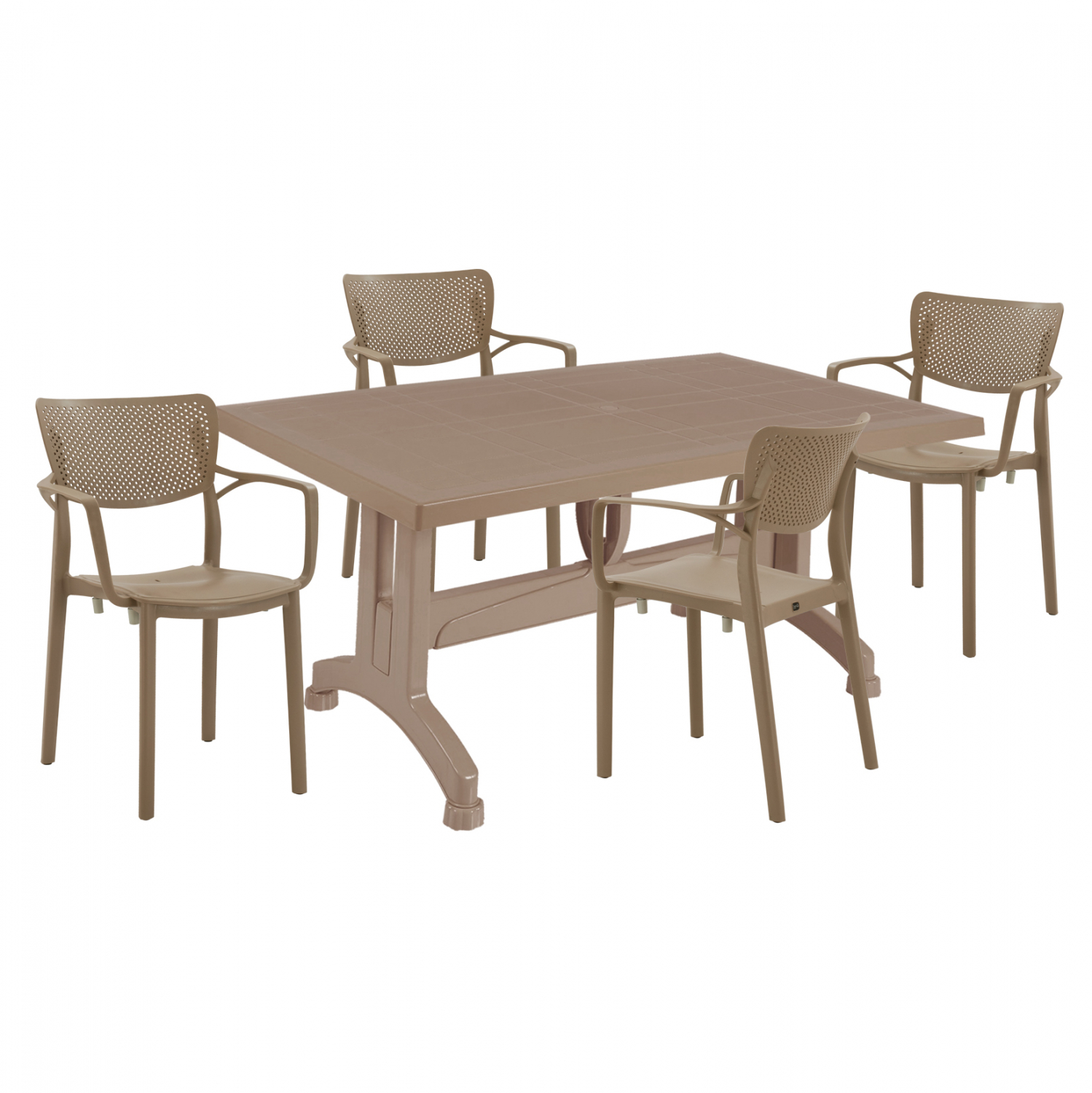 Σετ τραπεζαρίας 4 θέσεων. ΤΟ ΣΕΤ ΠΕΡΙΛΑΜΒΑΝΕΙ Ένα τραπέζι τραπεζαρίας πολυπροπυλενίου σε απόχρωση καπουτσίνο. Το τραπέζι διαθέτει ειδική θέση για ομπρέλα και ρεγουλατόρους στα πόδια. Είναι κατάλληλο για χρήση σε εσωτερικούς και εξωτερικούς χώρους. Απαγορεύεται η χρήση χημικών προϊόντων στην επιφάνεια του τραπεζιού . Διαστάσεις: 140x80x73,5 εκ. Τέσσερις πολυθρόνες κατασκευασμένες, από πολυπροπυλένιο σε καπουτσίνο απόχρωση. Η πολυθρόνα είναι στοιβαζόμενη, ώστε να μπορεί να αποθηκευτεί εύκολα. Αποτελεί έναν μοναδικό σχεδιασμό που θα αναδείξει κάθε γωνία του σπιτιού σας ή του επαγγελματικού σας χώρου. Διαστάσεις: 56x50x83 εκ. Διαστάσεις καθίσματος: 39x40 εκ. Ύψος καθίσματος: 46 εκ. Διαστάσεις μπράτσων: 31x20 εκ. Ύψος μπράτσων: 66 εκ. Διαστάσεις πλάτης: 45x26-41 εκ. Απόσταση ποδιών: 38x47 εκ. Ύψος ποδιών: 42 εκ.
