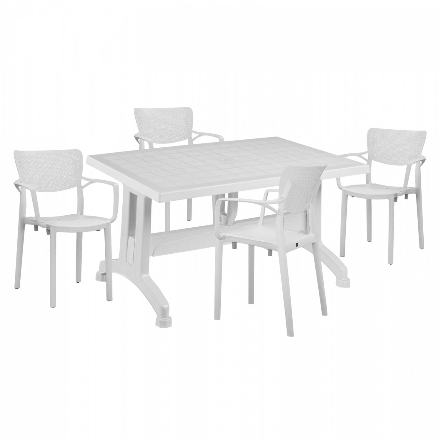 Σετ τραπεζαρίας 4 θέσεων. ΤΟ ΣΕΤ ΠΕΡΙΛΑΜΒΑΝΕΙ Ένα τραπέζι τραπεζαρίας πολυπροπυλενίου σε λευκή απόχρωση. Το τραπέζι διαθέτει ειδική θέση για ομπρέλα και ρεγουλατόρους στα πόδια. Είναι κατάλληλο για χρήση σε εσωτερικούς και εξωτερικούς χώρους. Απαγορεύεται η χρήση χημικών προϊόντων στην επιφάνεια του τραπεζιού . Διαστάσεις: 140x80x73,5 εκ. Τέσσερις πολυθρόνες κατασκευασμένες, από πολυπροπυλένιο σε λευκή απόχρωση. Η πολυθρόνα είναι στοιβαζόμενη, ώστε να μπορεί να αποθηκευτεί εύκολα. Αποτελεί έναν μοναδικό σχεδιασμό που θα αναδείξει κάθε γωνία του σπιτιού σας ή του επαγγελματικού σας χώρου. Διαστάσεις: 56x50x83 εκ. Διαστάσεις καθίσματος: 39x40 εκ. Ύψος καθίσματος: 46 εκ. Διαστάσεις μπράτσων: 31x20 εκ. Ύψος μπράτσων: 66 εκ. Διαστάσεις πλάτης: 45x26-41 εκ. Απόσταση ποδιών: 38x47 εκ. Ύψος ποδιών: 42 εκ.