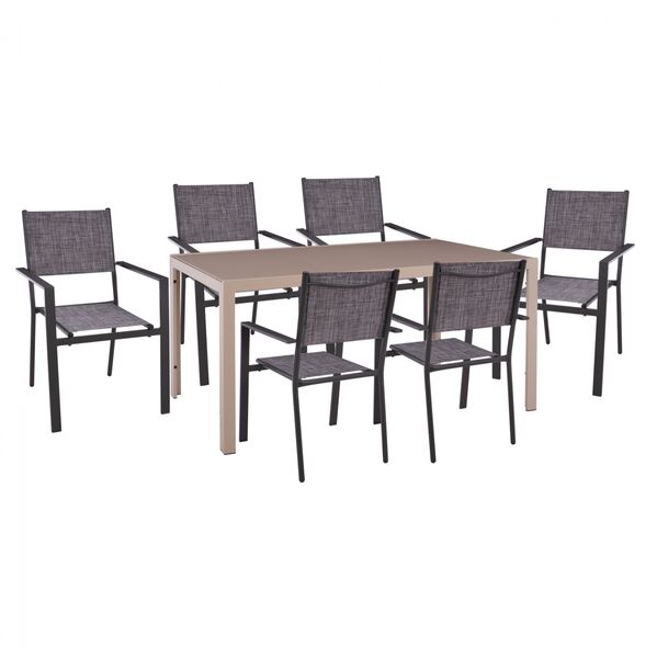 Σετ τραπεζαρίας 6 θέσεων. ΤΟ ΣΕΤ ΠΕΡΙΛΑΜΒΑΝΕΙ Ένα τραπέζι τραπεζαρίας εξωτερικού χώρου σε απόχρωση καπουτσίνο με γυαλί στην επιφάνειά του. Είναι ανθεκτικό καθώς είναι κατασκευασμένο από μέταλλο και αυτό το καθιστά κατάλληλο για χρήση σε εσωτερικούς αλλά και εξωτερικούς χώρους. Διαστάσεις: 150x90x75 εκ. Έξι μοντέρνες πολυθρόνες εξωτερικού χώρου κατασκευασμένες από μέταλλο, σε απόχρωση γκρι με textiline σε γκρι χρώμα. Κατασκευασμένη για μεγάλη αντοχή στον ήλιο και στην βροχή. Διαστάσεις: 57x56x90 εκ. Διαστάσεις καθίσματος: 40x45 εκ. Διαστάσεις πλάτης: 46x31,5 εκ. Απόσταση ποδιών: 52x53 εκ. Ύψος μπρατσου: 62 εκ. Υψος καθίσματος: 45 εκ. Ύψος ποδιών: 42 εκ. Χρώμα μετάλλου: Γκρι Χρώμα textiline: Γκρι