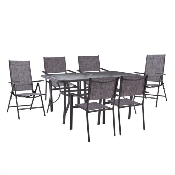 Σετ τραπεζαρίας 6 θέσεων. ΤΟ ΣΕΤ ΠΕΡΙΛΑΜΒΑΝΕΙ Ένα τραπέζι τραπεζαρίας μεταλλικό εξωτερικού χώρου σε γκρι απόχρωση με ενσωματωμένο τζάμι ασφαλείας (secure). Διαθέτει μια τρύπα στο κέντρο για την τοποθέτηση ομπρέλας. Διαστάσεις Τραπεζιού: 150x 90x75 εκ. Χρώμα: Γκρι Τέσσερις μοντέρνες πολυθρόνες εξωτερικού χώρου, κατασκευασμένες από μέταλλο σε γκρί απόχρωση με textiline σε γκρι χρώμα. Κατασκευασμένες για μεγάλη αντοχή στον ήλιο και στην βροχή. Διαστάσεις: 57x56x90 εκ. Διαστάσεις καθίσματος: 40x45 εκ. Διαστάσεις πλάτης: 46x31,5 εκ. Απόσταση ποδιών: 52x53 εκ. Ύψος μπρατσου: 62 εκ. Υψος καθίσματος: 45 εκ. Ύψος ποδιών: 42 εκ. Χρώμα μετάλλου: Γκρι Χρώμα textiline: Γκρι Δύο μοντέρνες πολυθρόνες εξωτερικού χώρου, κατασκευασμένες από μέταλλο σε γκρί απόχρωση και επενδυμένο με textilene σε γκρί απόχρωση. Διαθέτει μηχανισμό 7 θέσεων, με ψηλή πλάτη. Διαστάσεις: 55x70x103Y εκ. Ύψος καθίσματος: 42 εκ. Ύψος μπράτσων: 64 εκ. Διαστάσεις καθίσματος: 45x42 εκ.