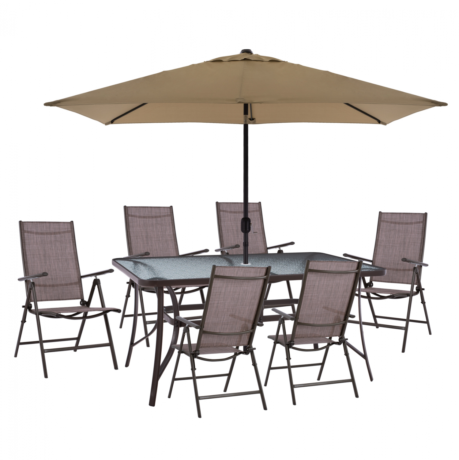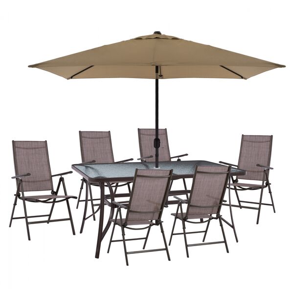Σετ τραπεζαρίας 6 θέσεων. ΤΟ ΣΕΤ ΠΕΡΙΛΑΜΒΑΝΕΙ Ένα τραπέζι τραπεζαρίας μεταλλικό εξωτερικού χώρου σε καφέ απόχρωση με ενσωματωμένο τζάμι ασφαλείας (secure). Διαθέτει μια τρύπα στο κέντρο για την τοποθέτηση ομπρέλας. Διαστάσεις: 150x 90x75 εκ. Χρώμα: Κάφε Έξι μοντέρνες πολυθρόνες εξωτερικού χώρου, κατασκευασμένες από μέταλλο σε καφέ απόχρωση και επενδυμένες με textilene σε καφέ χρώμα. Διαθέτει μηχανισμό 7 θέσεων, με ψηλή πλάτη. Διαστάσεις: 55x70x103Y εκ. Ύψος καθίσματος: 42 εκ. Ύψος μπράτσων: 64 εκ. Διαστάσεις καθίσματος: 45x42 εκ. Μια ομπρέλα αλουμινίου διαιρούμενη με αναβατόριο, σε μόκα και γκρι απόχρωση. Είναι κατασκευασμένη από σκελετό αλουμινίου σε γκρι απόχρωση και επένδυση από πολυεστερικό ύφασμα σε μόκα απόχρωση. Διαθέτει αεραγωγό για να επιτρέπει την κυκλοφορία του αέρα μειώνοντας ταυτόχρονα την πίεση του και αναβατόριο όπου προσφέρει ευκολότερο άνοιγμα και κλείσιμο. Διαστάσεις Ομπρέλας: 262x170x253 εκ. Διαστάσεις κάτω μέρους: 98 εκ. Διαστάσεις πάνω μέρους: 168 εκ. 6 Ακτίνες: 12