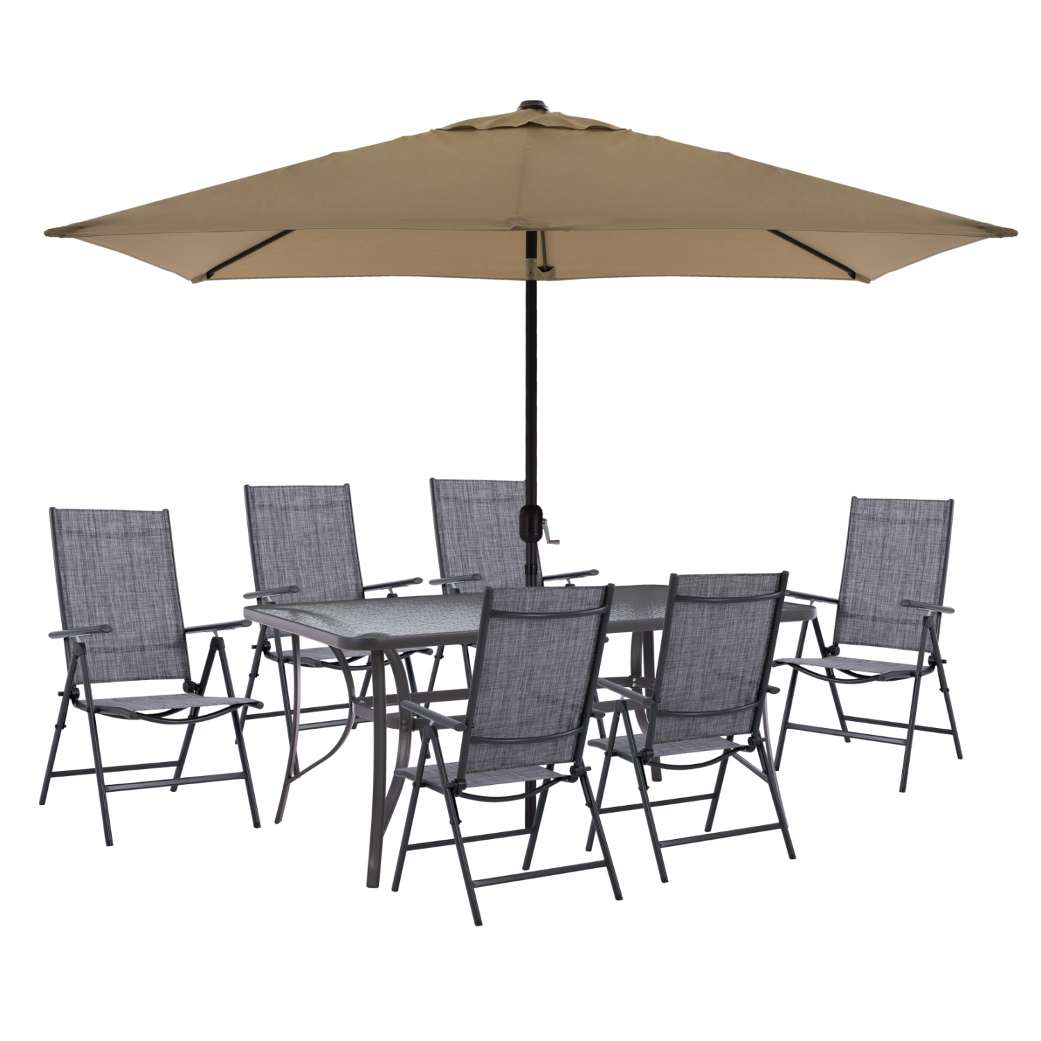 Σετ τραπεζαρίας 6 θέσεων με ομπρέλα. ΤΟ ΣΕΤ ΠΕΡΙΛΑΜΒΑΝΕΙ Ένα τραπέζι τραπεζαρίας μεταλλικό εξωτερικού χώρου σε γκρι απόχρωση με ενσωματωμένο τζάμι ασφαλείας (secure). Διαθέτει μια τρύπα στο κέντρο για την τοποθέτηση ομπρέλας. Διαστάσεις Τραπεζιού: 150x 90x75 εκ. Χρώμα: Γκρι Έξι μοντέρνες πολυθρόνες εξωτερικού χώρου, κατασκευασμένες από μέταλλο σε γκρί απόχρωση και επενδυμένο με textilene σε γκρί απόχρωση. Διαθέτει μηχανισμό 7 θέσεων, με ψηλή πλάτη. Διαστάσεις: 55x70x103Y εκ. Ύψος καθίσματος: 42 εκ. Ύψος μπράτσων: 64 εκ. Διαστάσεις καθίσματος: 45x42 εκ. Μια ομπρέλα αλουμινίου διαιρούμενη με αναβατόριο, σε μόκα και γκρι απόχρωση. Είναι κατασκευασμένη από σκελετό αλουμινίου σε γκρι απόχρωση και επένδυση από πολυεστερικό ύφασμα σε μόκα απόχρωση. Διαθέτει αεραγωγό για να επιτρέπει την κυκλοφορία του αέρα μειώνοντας ταυτόχρονα την πίεση του και αναβατόριο όπου προσφέρει ευκολότερο άνοιγμα και κλείσιμο. Διαστάσεις Ομπρέλας: 262x170x253 εκ. Διαστάσεις κάτω μέρους: 98 εκ. Διαστάσεις πάνω μέρους