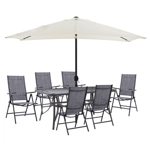 Σετ τραπεζαρίας 6 θέσεων με ομπρέλα. ΤΟ ΣΕΤ ΠΕΡΙΛΑΜΒΑΝΕΙ Ένα τραπέζι τραπεζαρίας μεταλλικό εξωτερικού χώρου σε γκρι απόχρωση με ενσωματωμένο τζάμι ασφαλείας (secure). Διαθέτει μια τρύπα στο κέντρο για την τοποθέτηση ομπρέλας. Διαστάσεις Τραπεζιού: 150x 90x75 εκ. Χρώμα: Γκρι Έξι μοντέρνες πολυθρόνες εξωτερικού χώρου, κατασκευασμένες από μέταλλο σε γκρί απόχρωση και επενδυμένο με textilene σε γκρί απόχρωση. Διαθέτει μηχανισμό 7 θέσεων, με ψηλή πλάτη. Διαστάσεις: 55x70x103Y εκ. Ύψος καθίσματος: 42 εκ. Ύψος μπράτσων: 64 εκ. Διαστάσεις καθίσματος: 45x42 εκ. Μια ομπρέλα αλουμινίου διαιρούμενη με αναβατόριο, σε μπεζ και γκρι απόχρωση. Είναι κατασκευασμένη από σκελετό αλουμινίου σε γκρι απόχρωση και επένδυση από πολυεστερικό ύφασμα σε μπεζ απόχρωση. Διαθέτει αεραγωγό για να επιτρέπει την κυκλοφορία του αέρα μειώνοντας ταυτόχρονα την πίεση του και αναβατόριο όπου προσφέρει ευκολότερο άνοιγμα και κλείσιμο. Διαστάσεις Ομπρέλας: 262x170x253 εκ. Διαστάσεις κάτω μέρους: 98 εκ. Διαστάσεις πάνω μέρους