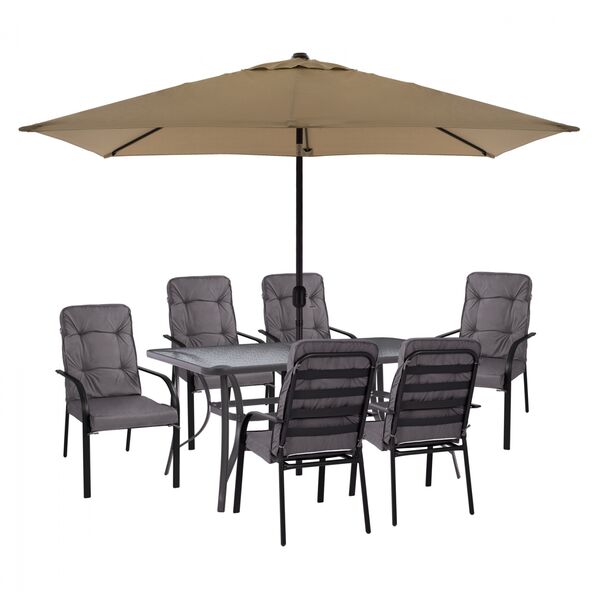 Σετ τραπεζαρίας 6 θέσεων με ομπρέλα. ΤΟ ΣΕΤ ΠΕΡΙΛΑΜΒΑΝΕΙ Ένα τραπέζι τραπεζαρίας μεταλλικό εξωτερικού χώρου σε γκρι απόχρωση με ενσωματωμένο τζάμι ασφαλείας (secure). Διαθέτει μια τρύπα στο κέντρο για την τοποθέτηση ομπρέλας. Διαστάσεις Τραπεζιού: 150x90x 75 εκ. Χρώμα: Γκρι Έξι μοντέρνες πολυθρόνες εξωτερικού χώρου, κατασκευασμένες από μέταλλο σε γκρι απόχρωση. Κατασκευασμένη από μεταλλικό σκελετό με μεταλλικούς ιμάντες στήριξης για το μαξιλάρι. Διαθέτει μαξιλάρι σε γκρι απόχρωση, με φερμουάρ για την πλάτη και το κάθισμα, πάχους 8 εκ. Μπορεί να χρησιμοποιηθεί για οικιακή και επαγγελματική χρήση. Διαστάσεις Καρέκλας: 60x71x105Y εκ. Ύψος καθίσματος: 49 εκ. Ύψος μπράτσων: 63 εκ. Διαστάσεις καθίσματος: 51x44 εκ. Πάχος μαξιλαριού: 8 εκ. Μια ομπρέλα αλουμινίου διαιρούμενη με αναβατόριο, σε μόκα και γκρι απόχρωση. Είναι κατασκευασμένη από σκελετό αλουμινίου σε γκρι απόχρωση και επένδυση από πολυεστερικό ύφασμα σε μόκα απόχρωση. Διαθέτει αεραγωγό για να επιτρέπει την κυκλοφορία του αέρα μειώνο