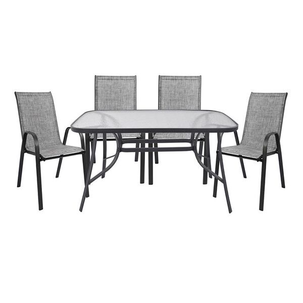ΤΟ ΣΕΤ ΠΕΡΙΛΑΜΒΑΝΕΙ Ένα τραπέζι μεταλλικό εξωτερικού χώρου σε χρώμα γκρι, με ενσωματωμένο τζάμι ασφαλείας (secure). Διαστ. Τραπεζιού: 140x80x72 εκ. Τέσσερις πολυθρόνες εξωτερικού χώρου από μεταλλικό σκελετό σε γκρι χρώμα με textilene 2x1 μεγάλης αντοχής σε ήλιο και βροχή. Διαστ. Καρέκλας: 54x70x93 εκ. Ύψος καθίσματος: 43 εκ. Ύψος μπράτσων: 59 εκ.
