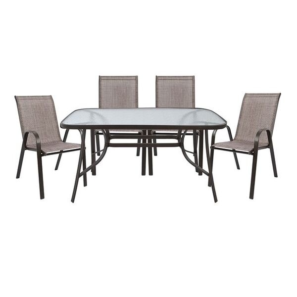 ΤΟ ΣΕΤ ΠΕΡΙΛΑΜΒΑΝΕΙ Ένα τραπέζι μεταλλικό εξωτερικού χώρου σε χρώμα καφέ, με ενσωματωμένο τζάμι ασφαλείας (secure). Διαστ. Τραπεζιού: 140x80x72 εκ. Τέσσερις πολυθρόνες εξωτερικού χώρου από μεταλλικό σκελετό σε καφέ χρώμα με textline 2x1 μεγάλης αντοχής σε ήλιο και βροχή. Διαστ. Καρέκλας: 54x70x93 εκ. Ύψος καθίσματος: 43 εκ. Ύψος μπράτσων: 59 εκ.
