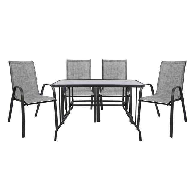 ΤΟ ΣΕΤ ΠΕΡΙΛΑΜΒΑΝΕΙ Ένα τραπέζι μεταλλικό εξωτερικού χώρου σε χρώμα γκρι-ανθρακί, με ενσωματωμένο τζάμι ασφαλείας (secure). Διαστ. Τραπεζιού: 110x60x71 εκ. Τέσσερις πολυθρόνες εξωτερικού χώρου από μεταλλικό σκελετό σε γκρι χρώμα με textilene 2x1 μεγάλης αντοχής σε ήλιο και βροχή. Διαστ. Καρέκλας: 54x70x93 εκ. Ύψος καθίσματος: 43 εκ. Ύψος μπράτσων: 59 εκ.